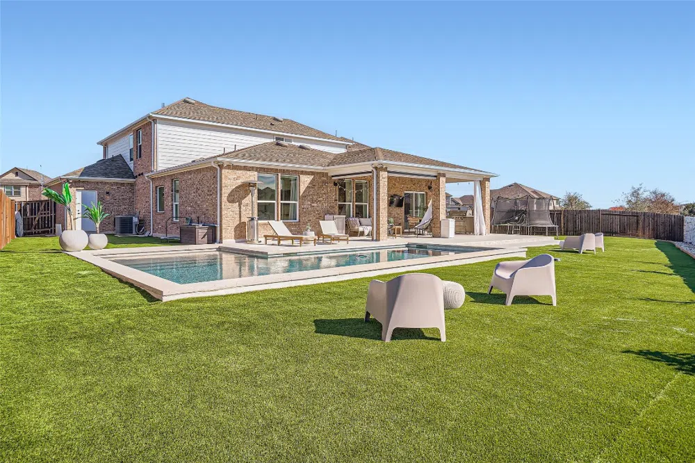 Welcome to this exquisite 5-bedroom, 3.5-bathroom home nestled on a 0.21-acre lot in the serene cul-de-sac of Mason Ranch. Boasting a sought-after mother-in-law floor plan, this gem features an expansive open layout bathed in natural light, complemented by an electric fireplace and motorized shades. The first floor is adorned with durable vinyl flooring throughout, setting the stage for both elegance and ease of maintenance. The heart of the home is the modern kitchen, equipped with contemporary countertops, a stunning waterfall island, and built-in oven and microwave - perfect for the culinary enthusiast. The open floor plan seamlessly connects to the living areas, ensuring a perfect space for gatherings and leisure. Step outside to the outdoor dream area, an entertainer's paradise with a heated pool, grill, and ample space for hosting. The dining and living areas extend into a vast, low-maintenance backyard, complete with a shed and patio deck, offering endless possibilities for relaxation and entertainment. Added conveniences include a 3-bay garage, a beautifully designed custom powder room, and a versatile office/studio space, greeting you as you walk through the elegant front door. This property, loaded with upgrades, is a perfect blend of luxury, comfort, and practicality - a true haven for those seeking a distinguished lifestyle in Mason Ranch